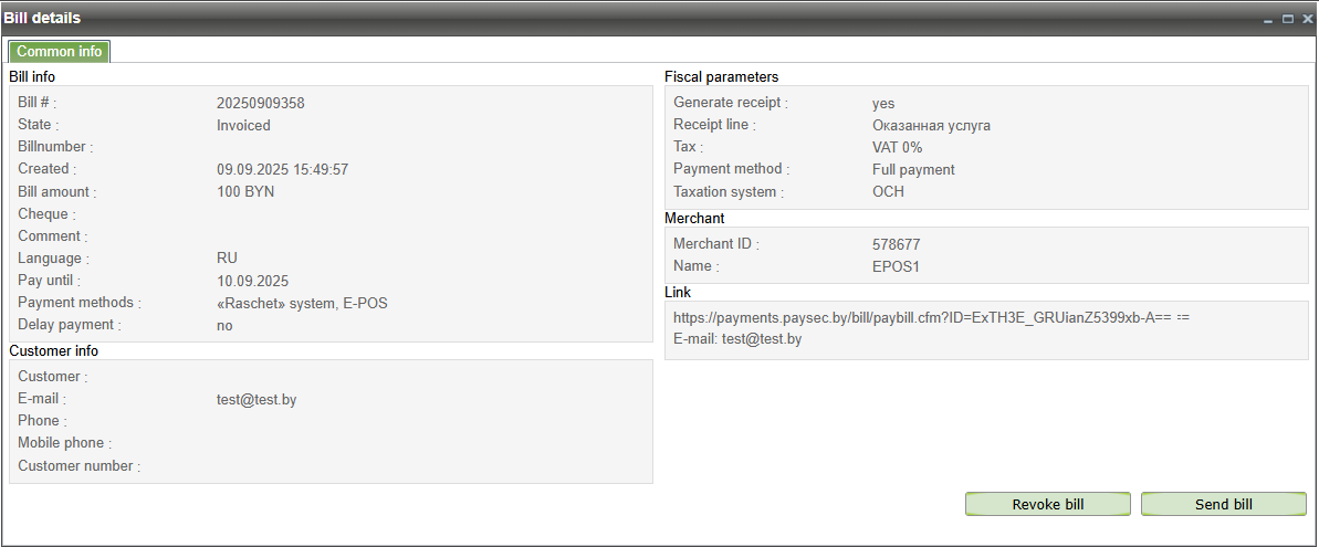 Bill _ currency | Yes | String | Bill currency (OrderCurrency BYN only) | |