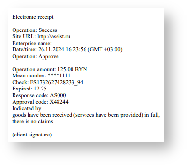 It is possible to change the view of the printed receipt on request by the enterprise. Please, contact support team (support@belassist.by) in such case.