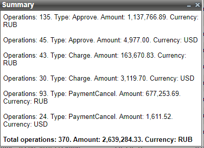 You'll see a total amounts for each currency and numbers of operations. Grand total amount and total operation count are shown in bottom.