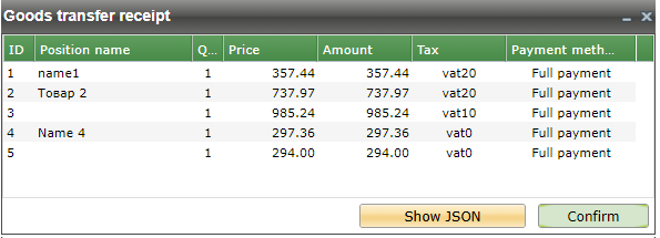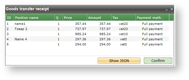 A receipt for the transfer of goods is sent to the OFD (fiscal data operator) using the Confirm button. If a receipt was split into several receipts due to a large number of items (in accordance with the configured maximum number of items in a receipt), then the confirmation window displays the IDs of all created receipts.