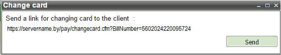 The card replacement for subsequent payments by subscription (recurrent payments) can be initiated from the personal account in case when the card that was used in that subscription is expiring or has already expired. When you select "Change card" option from the context menu then new window is opened with a proposal to send the reference for card replacement to the payer.