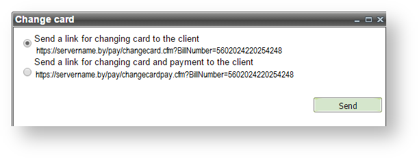 If the last subsequent payment is unsuccessful at the moment of selecting the context menu item "Change card" (the card is already expired, insufficient cash and so on), then You can select one of two links to send to customer: link to replace the card or link to replace card and pay the unsuccessful payment.