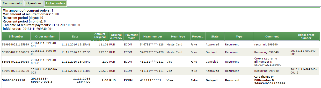 The information about blocked amount is displayed also in the tab ’Related orders’ of order details dialog for any payment of this subscribe. The "Comment" field shows the cause of the blocking payment.