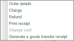 You can perform the following actions over order in the Order monitor window: payment confirmation (Charge), payment cancellation (Refund), print the bill (Print receipt).