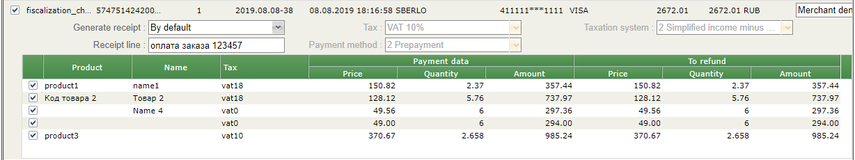 - Fiscalization is performed at the order confirmation. If the fiscalization parameters were sent, they are displayed in the confirmation window and are available for editing. If the fiscalization parameters were not sent, then they are set by default according to the merchant settings and available for editing in the confirmation window.
