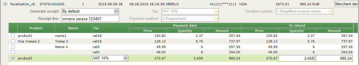 At the moment of editing the quantity of the refunded product, the value in the column "Amount" may be still not changed. It is necessary to pay attention to the amount to be refunded, displayed in the top row of the refund window. The jumping of the cursor to any other row of the table recalculates the amount of the refunded product in the previously edited position.