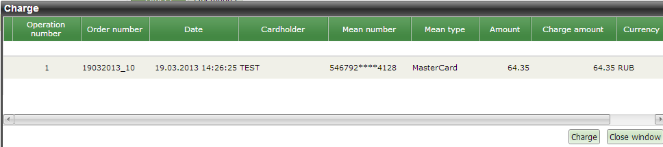 'Charge amount' by default filled by full authorized amount. Some processings allow to confirm partial amount. For this – enter the desired amount in the 'Charge amount' field.