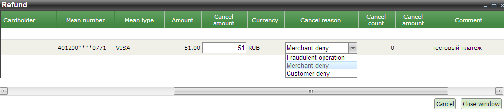 Column 'Cancel amount' contains (by default) the full authorization amount. It can be changed (decreased) in case when a partial cancellation is required (for example the customer decided to return a part of the ordered items). The 'Reason' field should be set according to reason of cancellation. By default it is set to 'Customer deny' value.
