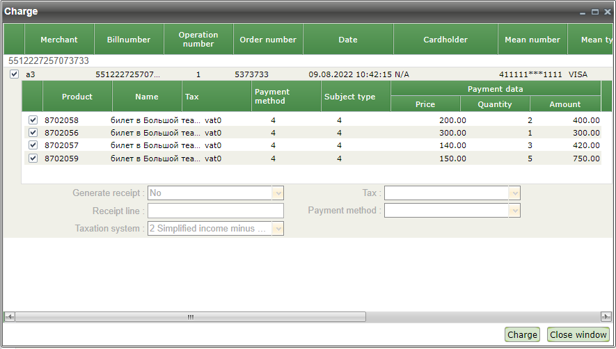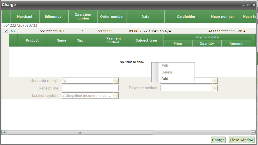 When you select 'Charge' option in the order's context menu the 'Charge' window will appear as it shown on the picture below.