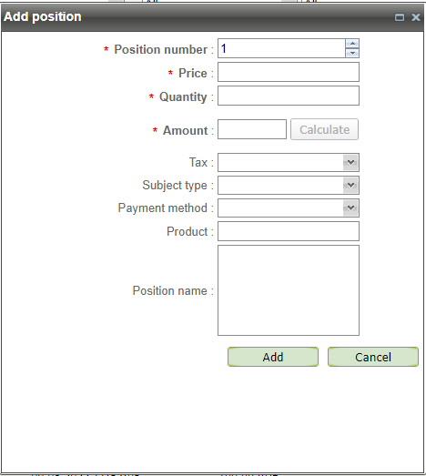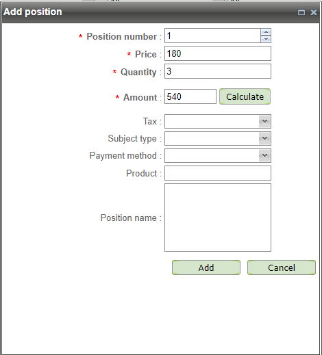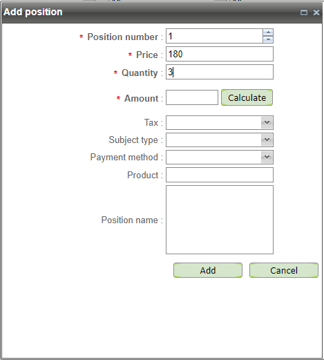 After filling the "Price" and "Quantity" fields, the "Calculate" button becomes active. Pressing this button automatically fills the "Amount" field with the calculated value (Price*Quantity).