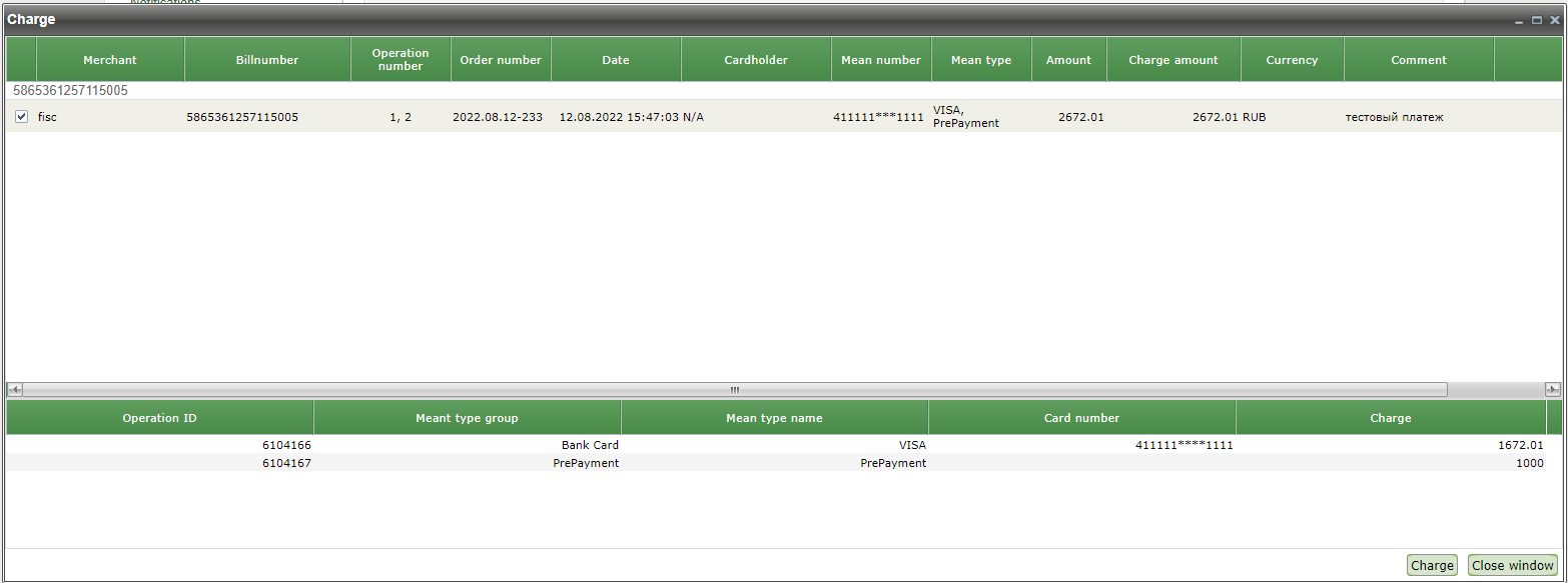 When you select 'Charge' option from the order's context menu for prepaid payments, the window consisting of two blocks will be opened. The first block displays the parameters of the order, for which the charge will be made (similar to table). If a prepayment has been made for the order, then the second block of the 'Charge' window displays the payment operations parameters for this order.