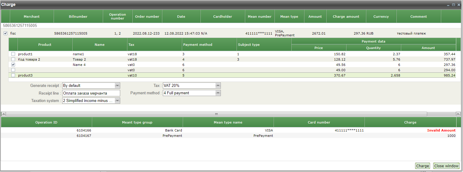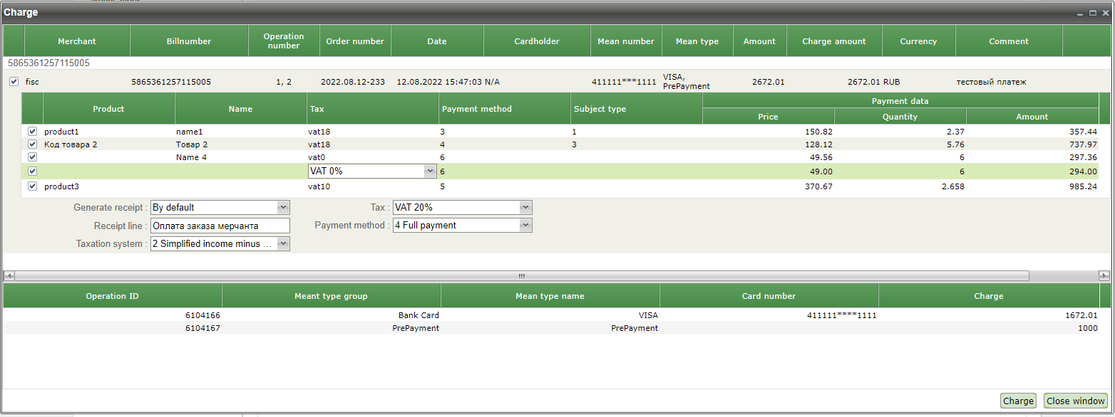 By default, all items are marked for charge and the maximum amount for confirmation and the amount of the available prepayment are indicated in the column "Charge". Only the tax rate is available for editing for each item. Double click on the row of charged item allows you to start editing it.