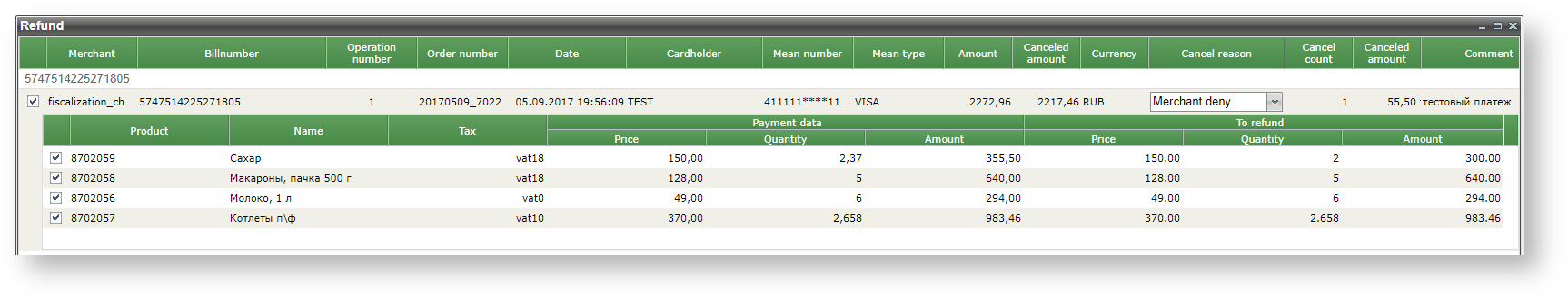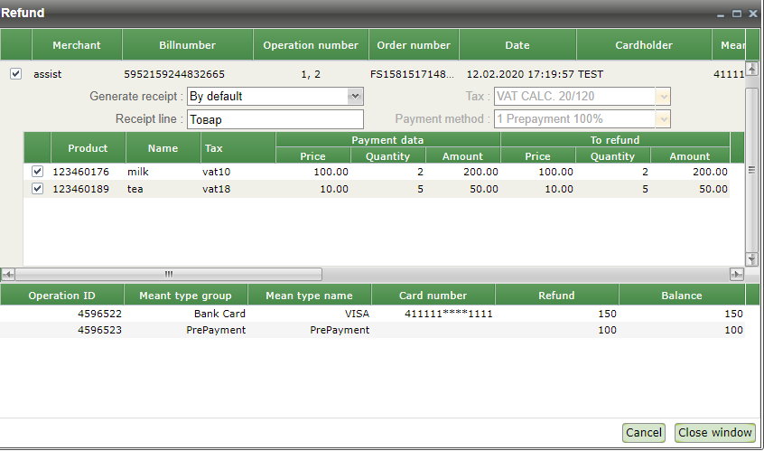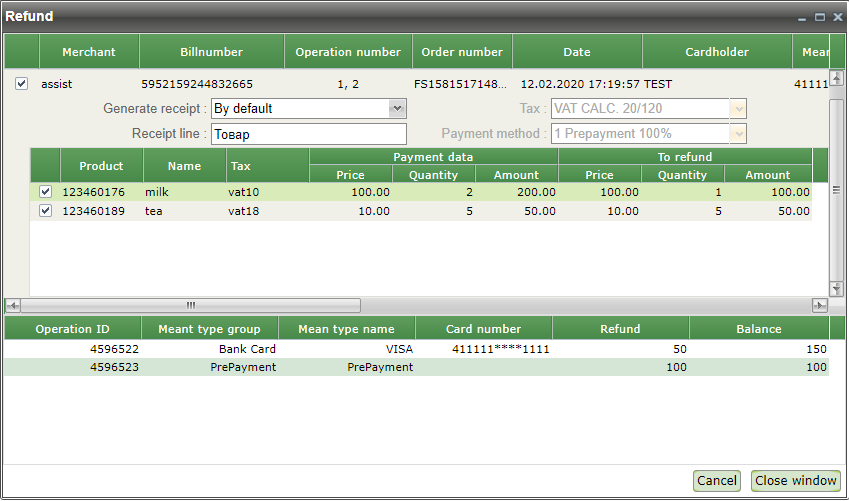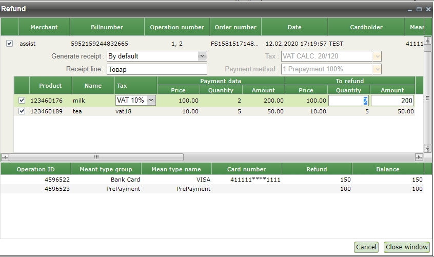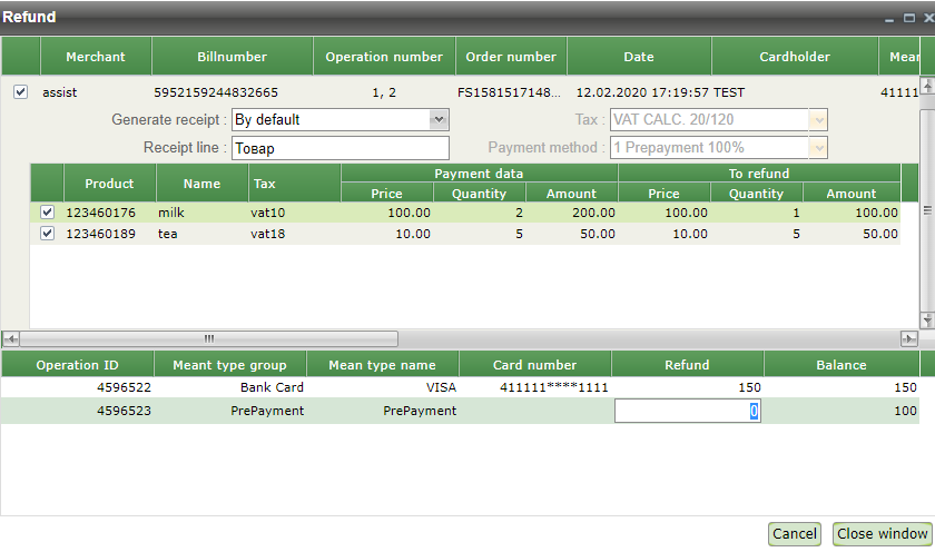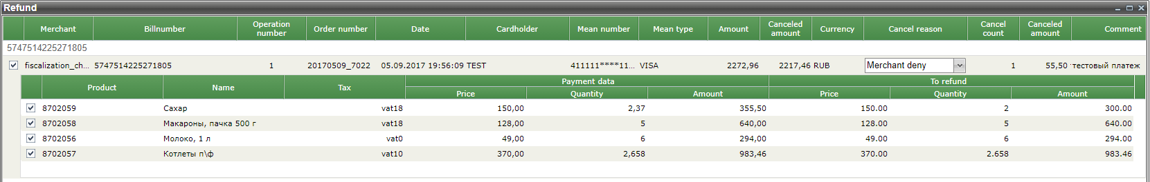 Pressing the "Cancel" button cancels the purchase of the specified quantity of product in the specified item. Now, after reopening the refund window, the amount to be refunded for this order will be displayed in the top row, as well as the previously returned amount.