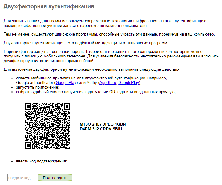 В данном разделе отображается краткая инструкция по включению двухфакторной аутентификации, а также имеется поле для ввода специального кода подтверждения.