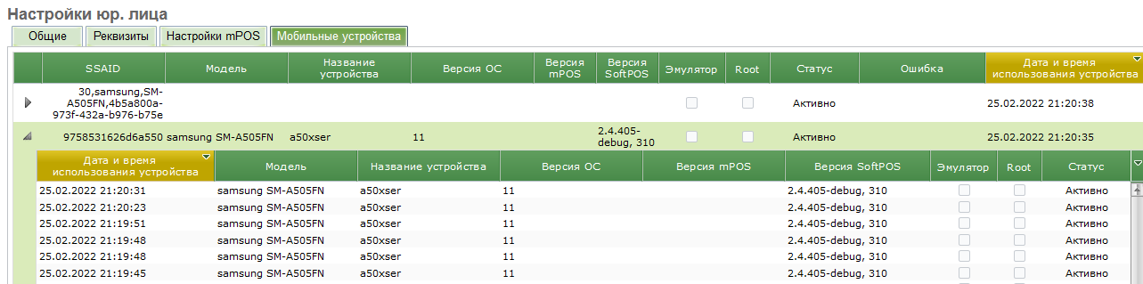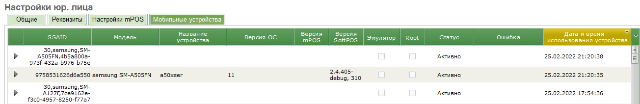Вкладка предназначена для просмотра статусов устройств с установленным приложением SoftPos, зарегистрированных в АПК Ассист. Также здесь можно зарегистрировать новое устройство.