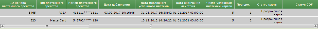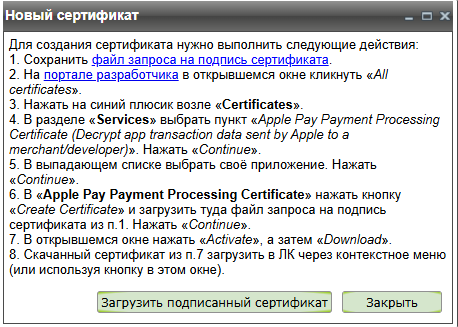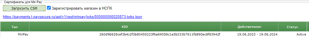 В этом блоке отображается таблица текущих сертификатов Mir Pay предприятия.