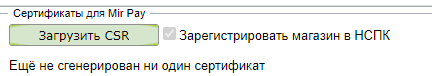 При первоначальной регистрации сертификата регистрация магазина в НСПК обязательна. Поэтому чек-бокс "Зарегистрировать магазин в НСПК" отмечен и неактивен. Также имеется указание на то, что ни один сертификат пока не сгенерирован.