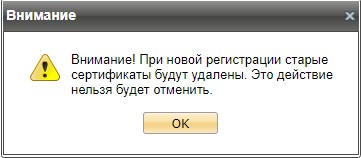 Если же по каким-либо причинам необходима повторная регистрация в НСПК, то следует заново отметить чек-бокс "Зарегистрировать магазин в НСПК" перед загрузкой запроса на сертификат с помощью кнопки «Загрузить CSR», в этом случае выдается специальное предупреждение: