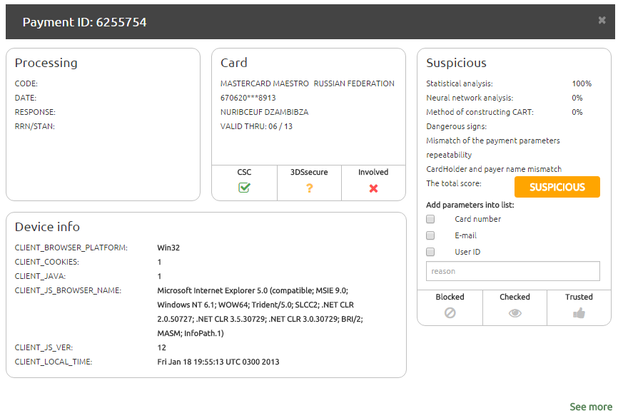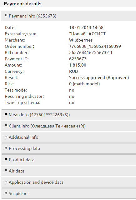 In the field ‘Fraud Suspiciousness’ is shown the SOFI conclusion about the payment suspicion (final scoring) is derived based on estimates of the mathematical models, expert conclusions and other reasons. The reason, by which the final scoring was set, is displayed in brackets.