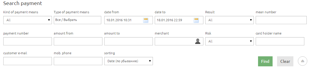 Search by this field ignores the other fields (for example, time period or type of payment means), it is performed over all transactions available to the current user.