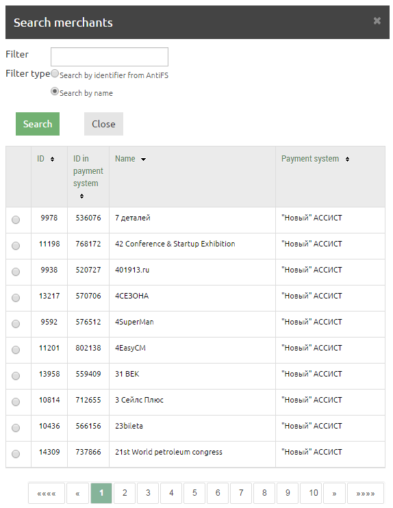 The search can be performed by merchant identity from SOFI or by name. The search results are displayed in a table. The search is performed among those merchants whose payments are available for review according to the user rights, if this merchant has any payments in SOFI.