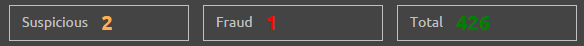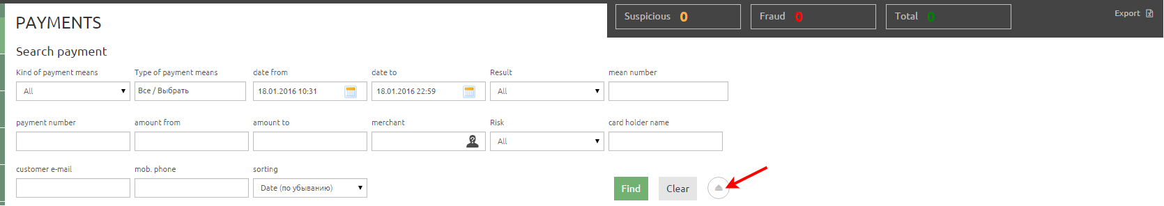 The buttons in upper part of the screen displays numbers of fraudulent and suspicious payments after preparing of request results in accordance with the search filter.