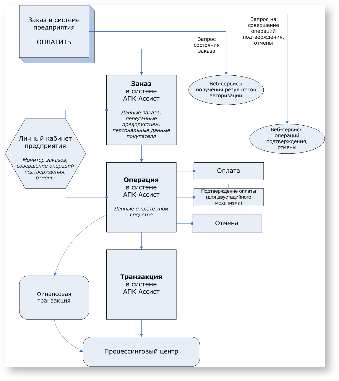 В зависимости от ответа процессингового центра (успешно или нет прошла авторизация) транзакция, операция и заказ в системе АПК Ассист переходят в соответствующие состояния. После успешной операции оплаты состояние заказа становится Delayed. Обычно для одного заказа может быть только одна успешная операция оплаты (кроме оплаты бонусными баллами).