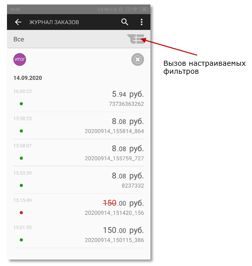 В журнале заказов можно в любой момент просмотреть результат работы приложения mPOS за текущий день. Для просмотра итогов следует нажать на кнопку «Итого за <ДАТА>», после чего отобразится итог за день в виде выпадающего списка значений: