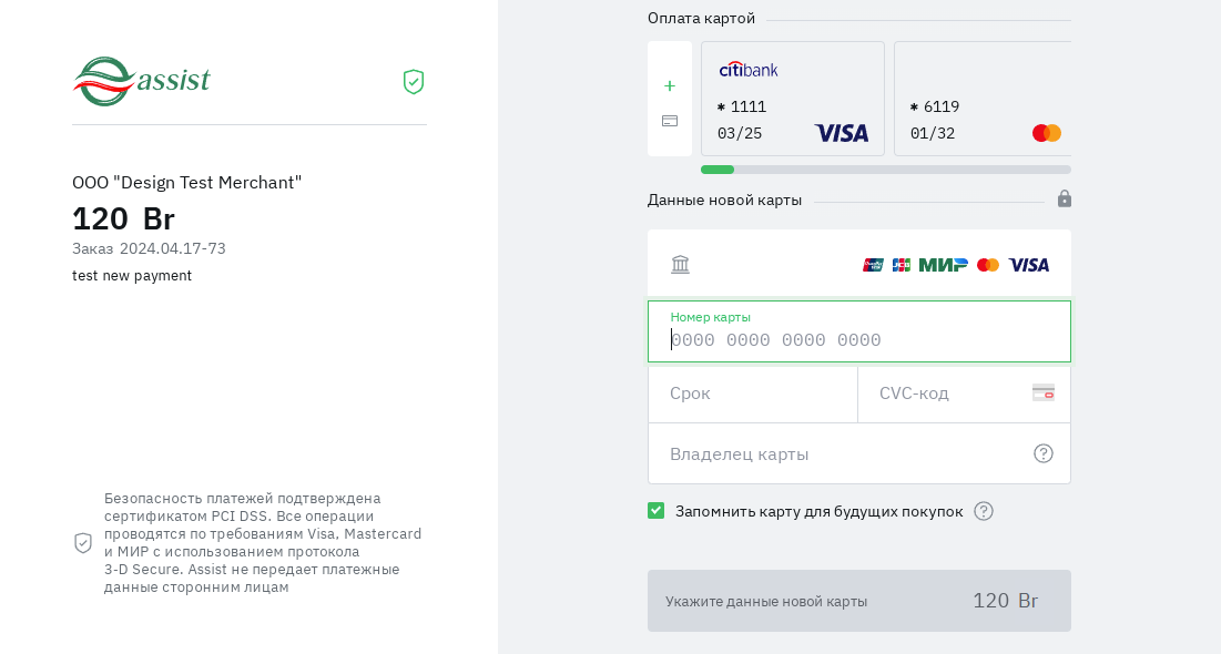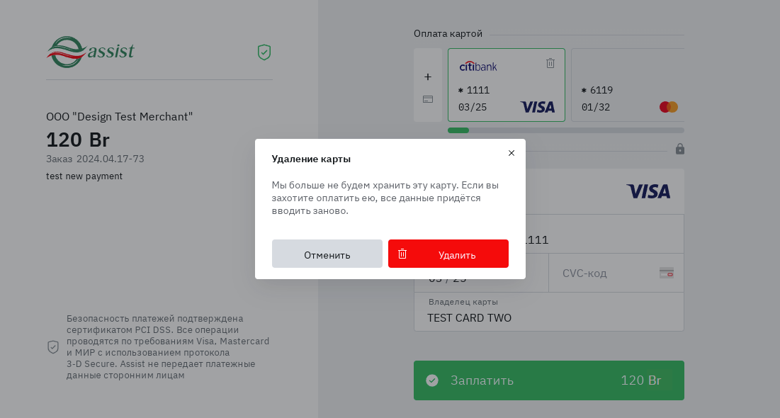 Если у клиента имеется более одной сохраненной карты, то все они отобразятся на платежной странице, чтобы клиент смог выбрать из них нужную для осуществления платежа.