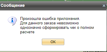 Если фискализация данного заказа не проводилась или прошла с ошибкой, чек на передачу товара не формируется и выдается следующая ошибка: