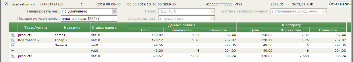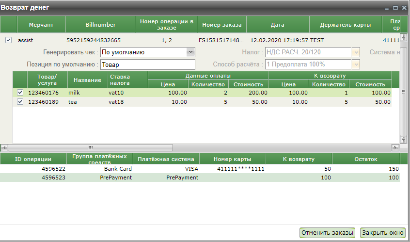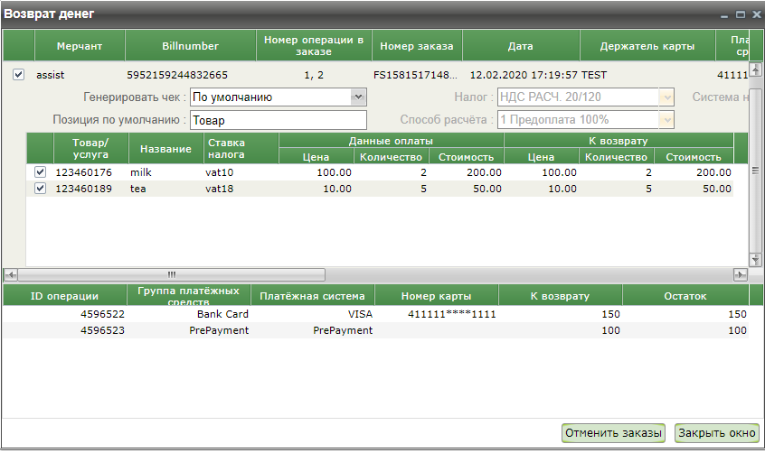 Если при создании заказа были переданы данные чека, то двойной клик на таком заказе в окне возврата денежных средств открывает новое окно, в котором отображаются позиции заказа. Отмена таких заказов осуществляется только с помощью полной или частичной отмены их позиций.
