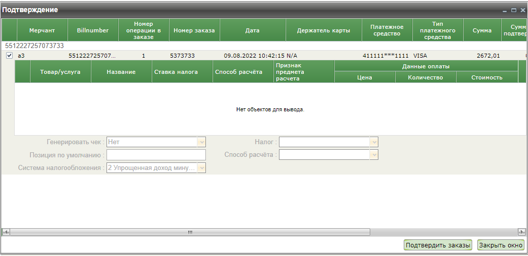 Если предприятие работает с чеком и передает при заказе позиции чека, то и подтверждение может быть выполнено только для заказов с позициями чека.