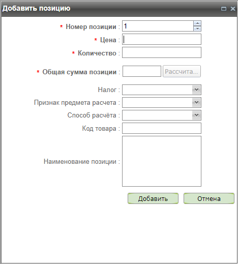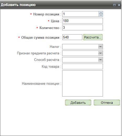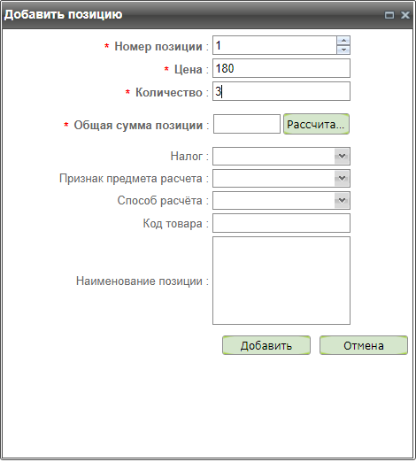 После заполнения полей «Цена» и «Количество» становится активной кнопка «Рассчитать». Нажатие этой кнопки автоматически заполняет поле «Общая сумма позиции» вычисленным значением (Цена*Количество).