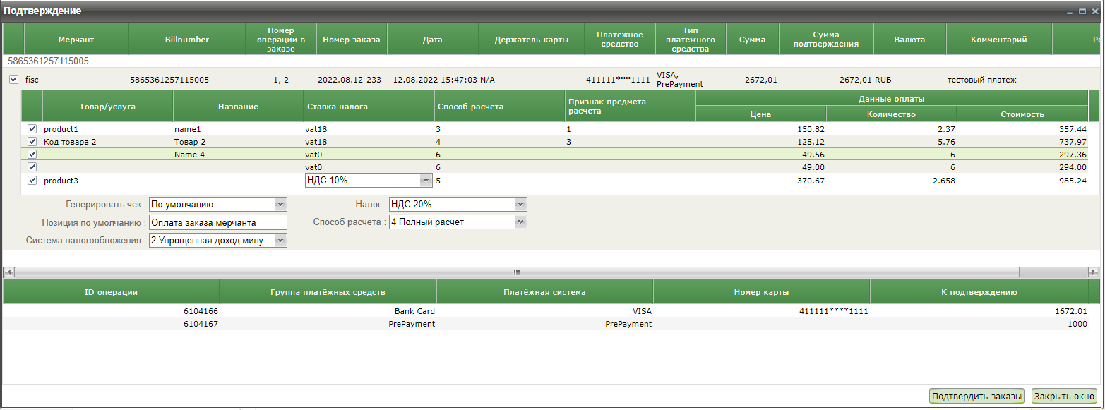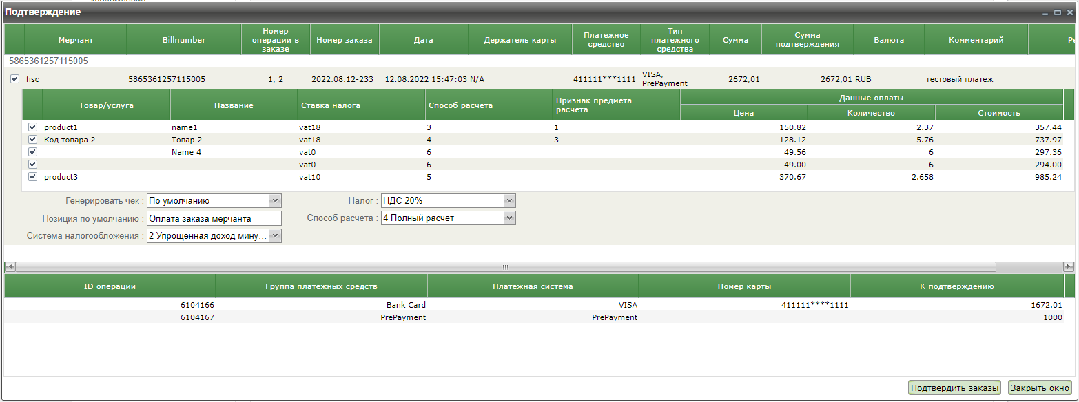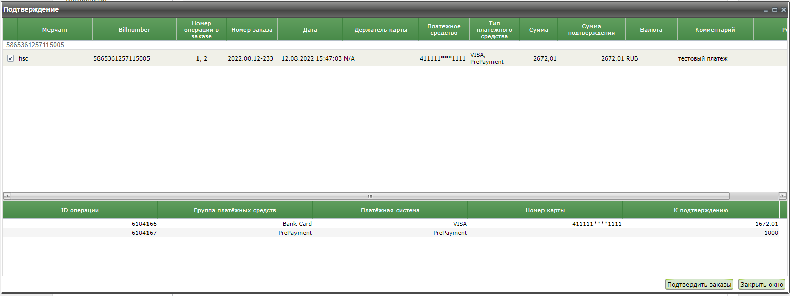 При выборе пункта контекстного меню «Подтверждение» для платежей с предоплатой открывается окно, состоящее из двух блоков. В первом блоке отображаются параметры заказа, по которому будет производиться подтверждение аналогично таблице. Если для заказа была выполнена предоплата, то во втором блоке окна «Подтверждение» отображаются параметры операций оплаты этого заказа.