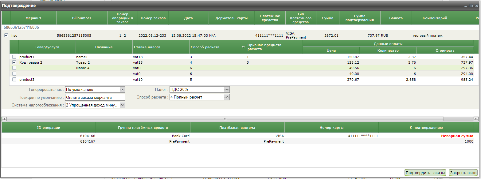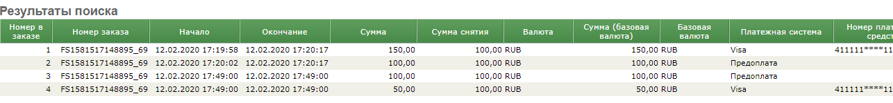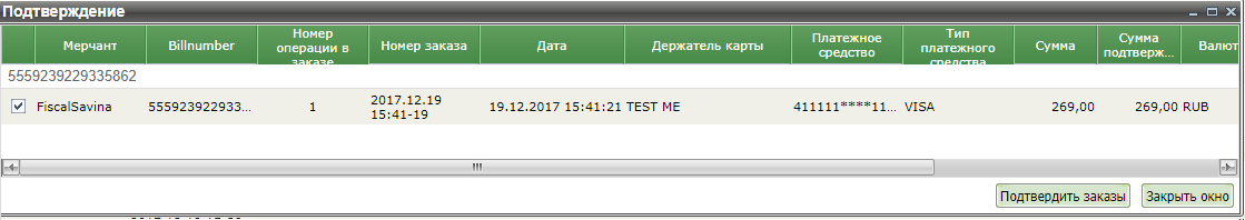 После нажатия кнопки «Подтвердить заказы» в колонке «Результат» отображается результат для каждого заказа, по которому производилось снятие денежных средств. В случае неуспеха отображается соответствующая ошибка.