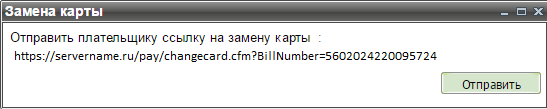 Замена карты для плательщика может быть инициирована предприятием из личного кабинета в том случае, если по данной карте выполняются платежи по подписке (рекуррентные платежи) и срок действия участвующей в этих платежах карты истекает или уже истек. При выборе в контекстном меню пункта «Замена карты» открывается окно с предложением отправки плательщику ссылки на замену карты.