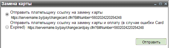 Если на момент выбора в контекстном меню пункта «Замена карты» очередной платеж по подписке был неуспешным (истек срок действия карты, недостаточно средств на счету и т.п.), то открывается окно, в котором можно выбрать нужную ссылку для отправки клиенту – на замену карты или на замену карты и оплату неуспешного платежа.