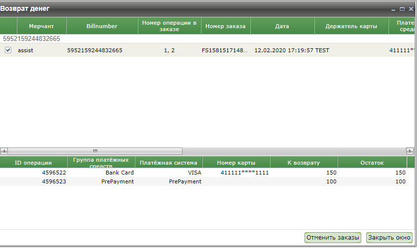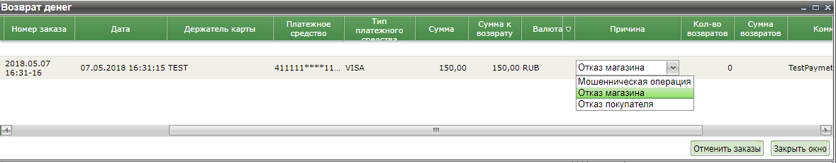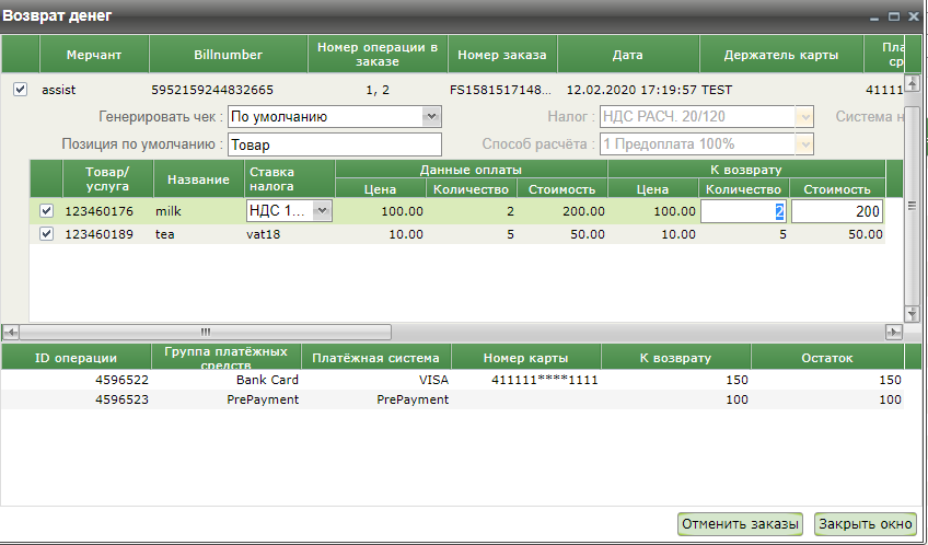 Нажатие кнопки «Отменить заказы» отменяет покупку указанного количества товара в указанной позиции. Теперь после открытия заново окна возврата денежных средств в верхней строке будет отображаться как возможная сумма к возврату по данному заказу, так и уже ранее возвращенная сумма.