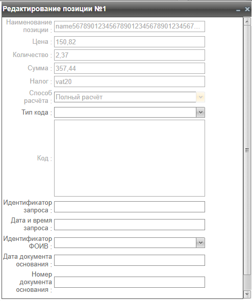 Окно редактирования позиции