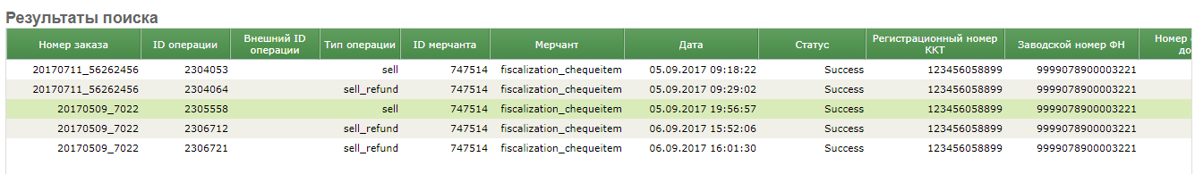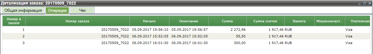 Во вкладке «Операции» можно увидеть все операции по данному заказу. В примере ниже имеются три операции – оплата, частичная отмена одной позиции и полная отмена этой позиции.