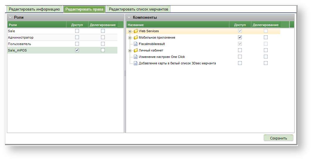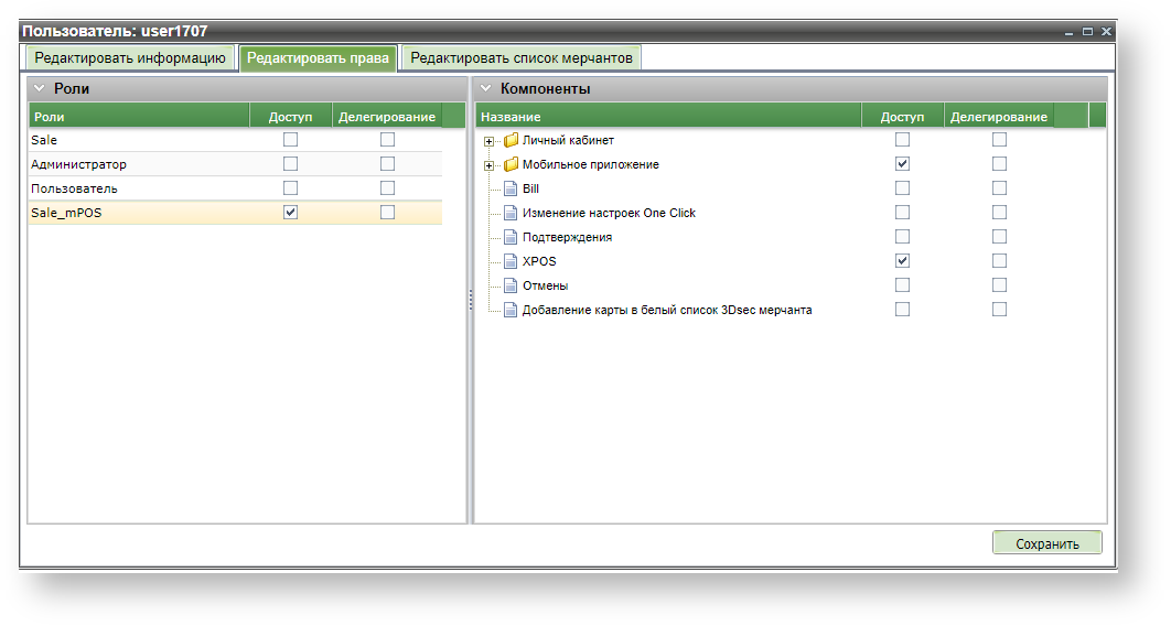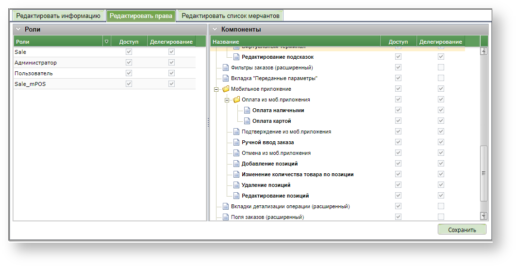 - в открывшемся окне редактирования прав в разделе «Роли» необходимо поставить галочку в колонке «Роли» напротив пункта «Sale_mPOS»;