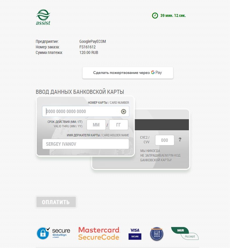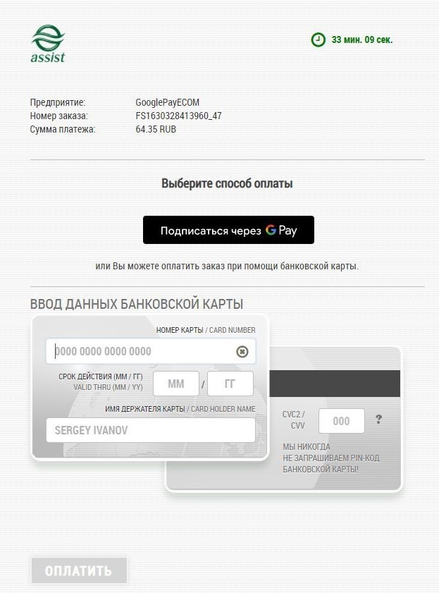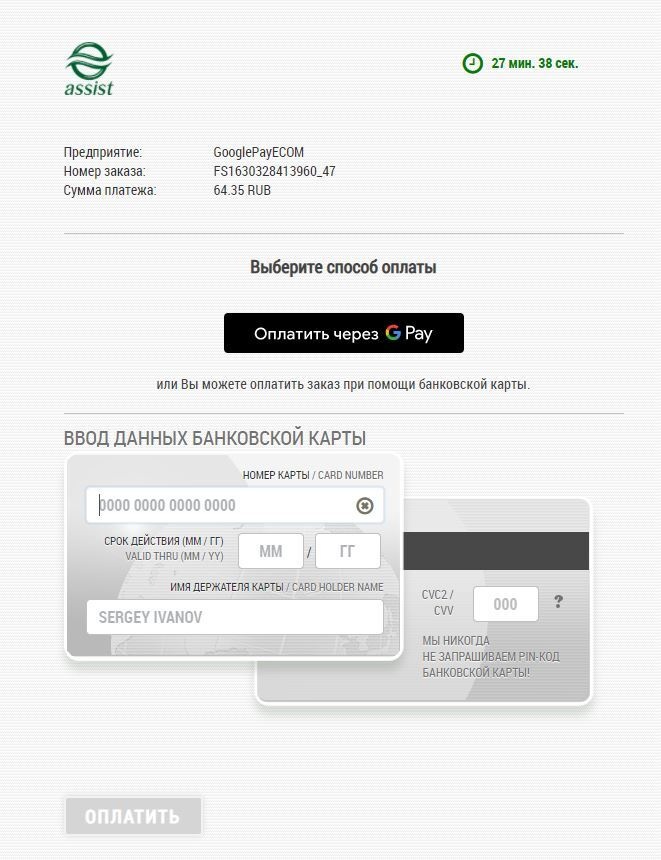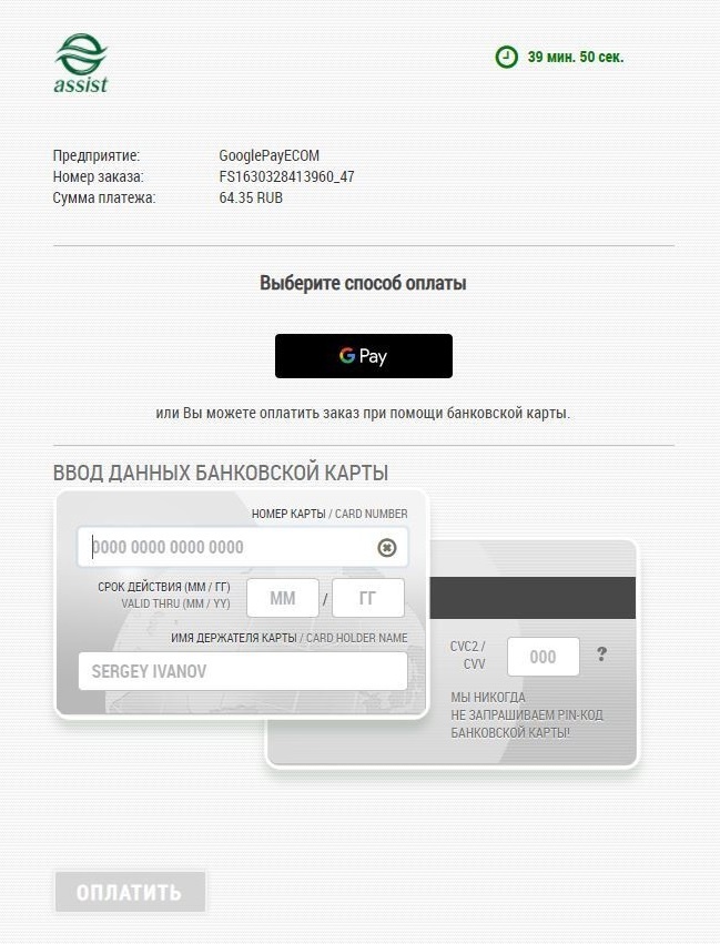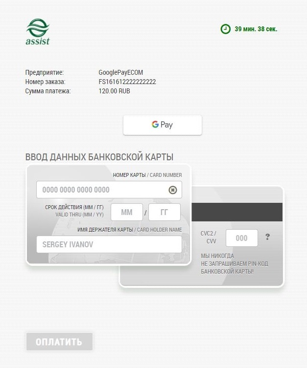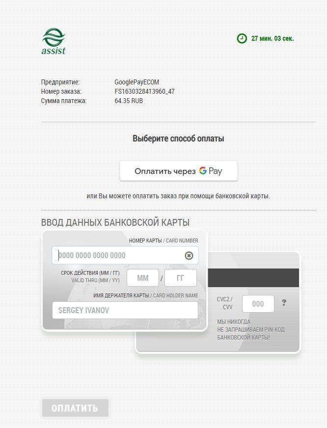 *Внимание! При использовании iframe для отображения платежной страницы АПК Ассист и оплате через Google Pay требуется добавление разрешения allowpaymentrequest. Пример: <iframe allowpaymentrequest src="...">. |
