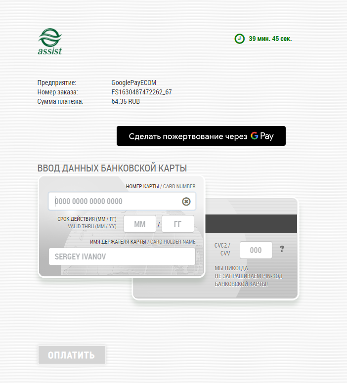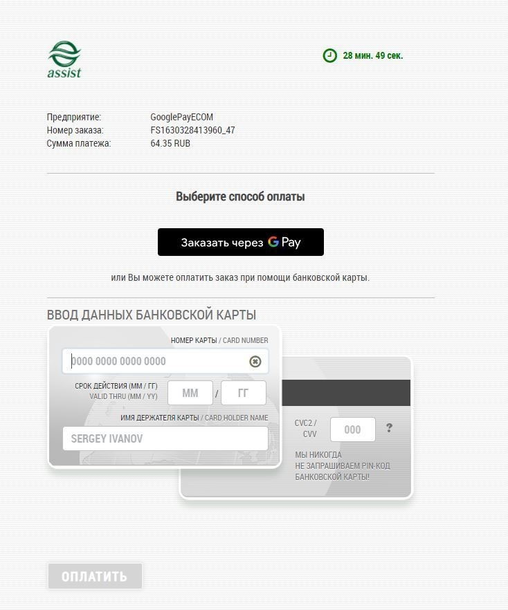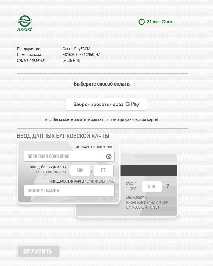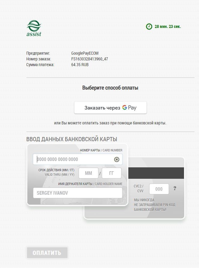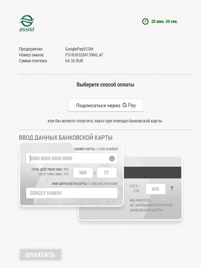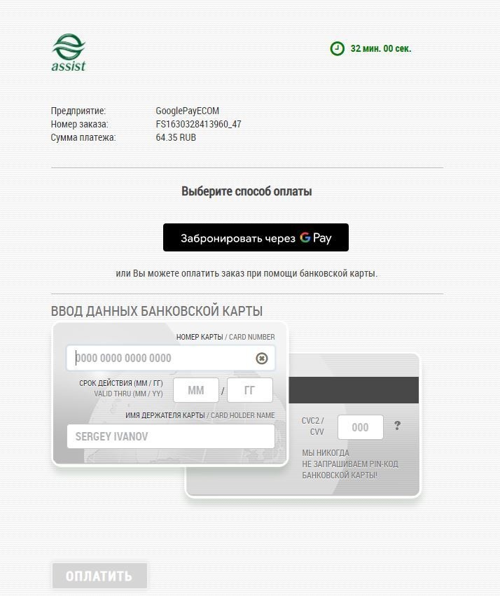 *Внимание! При использовании iframe для отображения платежной страницы АПК Ассист и оплате через Google Pay требуется добавление разрешения allowpaymentrequest. Пример: <iframe allowpaymentrequest src="...">. |