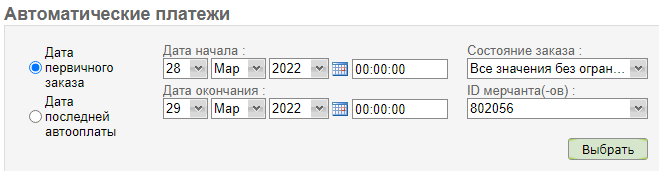 Для удобной работы в разделе автоматических платежей предусмотрен ряд фильтров, использование которых облегчает поиск по заранее известным критериям. Применение всех фильтров производится после нажатия кнопки «Выбрать».