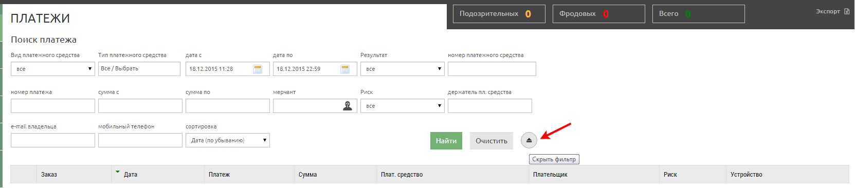 Риск | Выбор из выпадающего списка значений вероятности мошенничества: Все, Чистый, Подозрительный, Фрод. (Подробнее см. ниже подраздел «Детализация платежа» в п.3.1.6) |