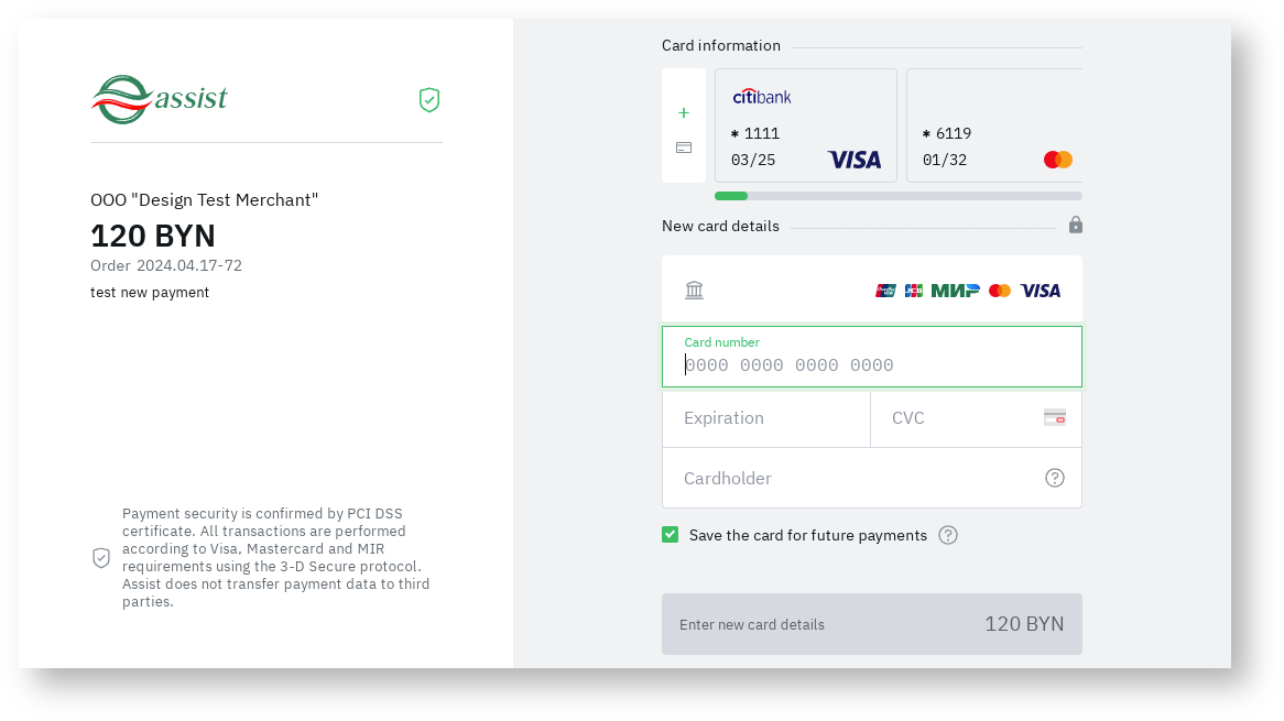 If the customer agrees to use one of the previously saved cards to pay, then he is prompted to enter only the code CVC2 during the payment.