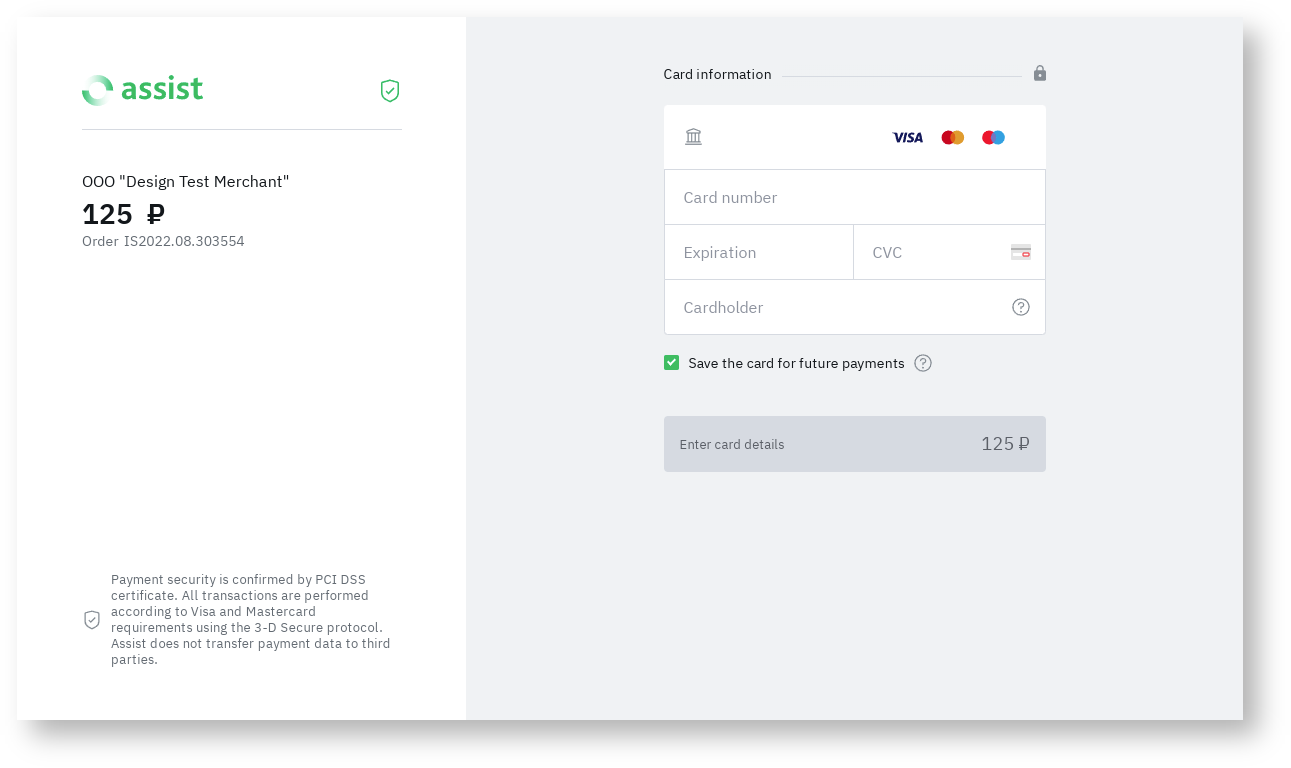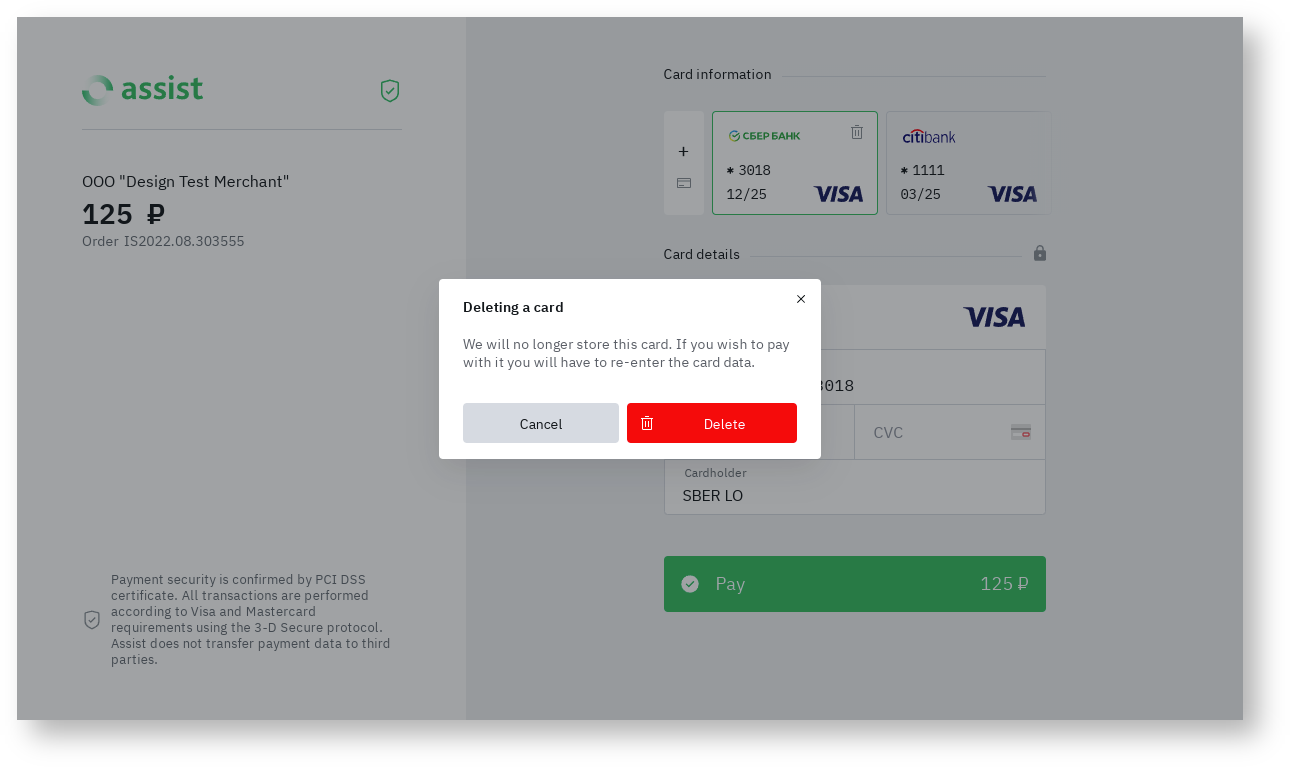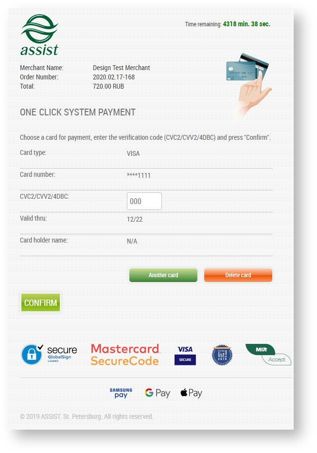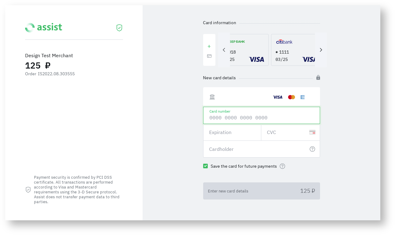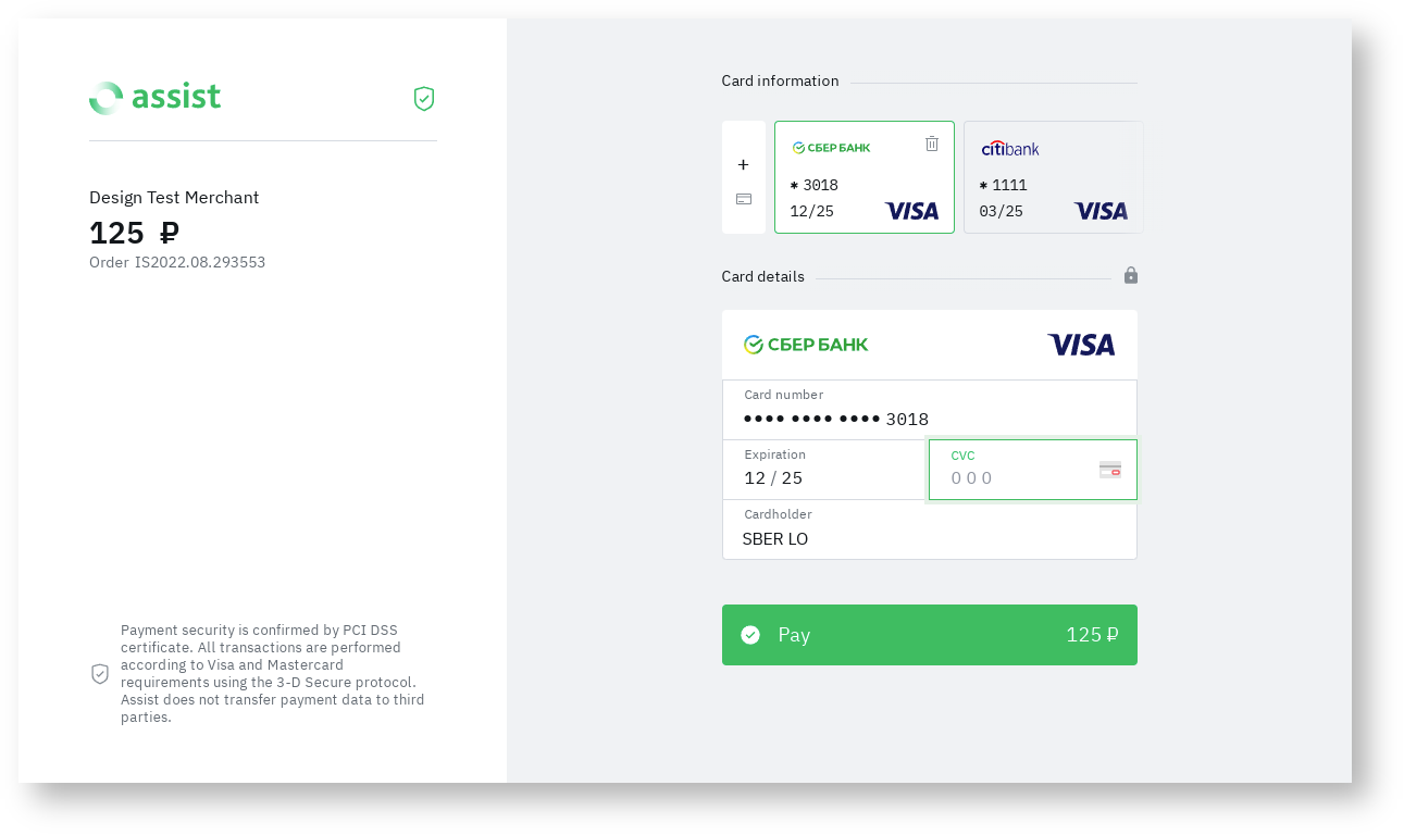 If the customer agrees to use one of the previously saved cards to pay, then he is prompted to enter only the code CVC2 during the payment.