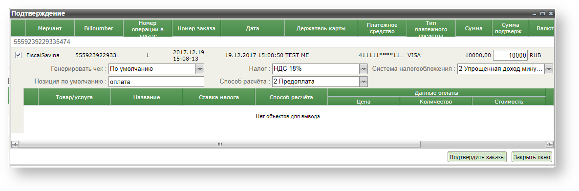 1. Фискализация выполняется на этапе авторизации заказа. Все параметры фискализации должны быть переданы предприятием при оплате заказа. Если параметры не переданы, то они устанавливаются по умолчанию согласно настройкам предприятия. В окне подтверждения параметры фискализации недоступны для редактирования.