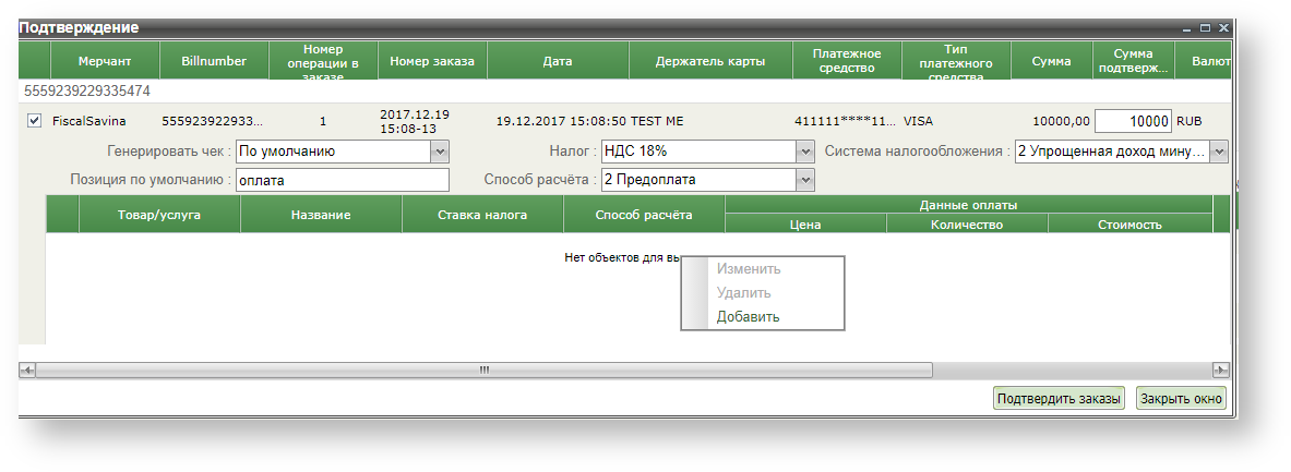 Если предприятие использует двухстадийный механизм работы, то после завершения авторизации по карте и блокирование средств на счету клиента, предприятию необходимо в течение 5-14 дней (в зависимости от процессинга) провести финансовую транзакцию для подтверждения снятия денег со счета. Пользователь предприятия может совершить данную операцию, выбрав в контекстном меню заказа пункт «Подтверждение».