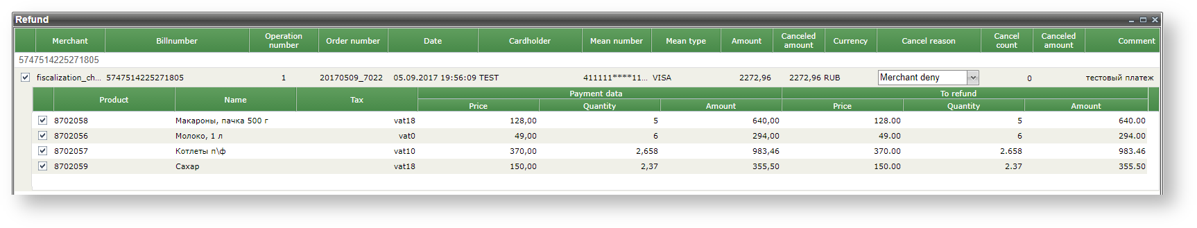 Если при создании заказа были переданы данные чека, то двойной клик на таком заказе в окне возврата денежных средств открывает новое окно, в котором отображаются позиции заказа. Отмена таких заказов осуществляется только с помощью полной или частичной отмены их позиций.